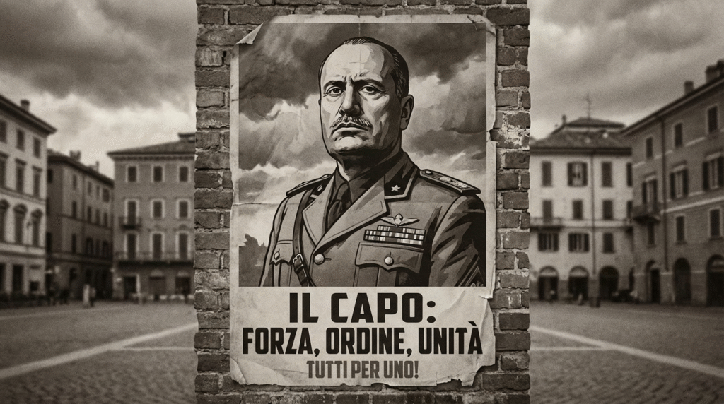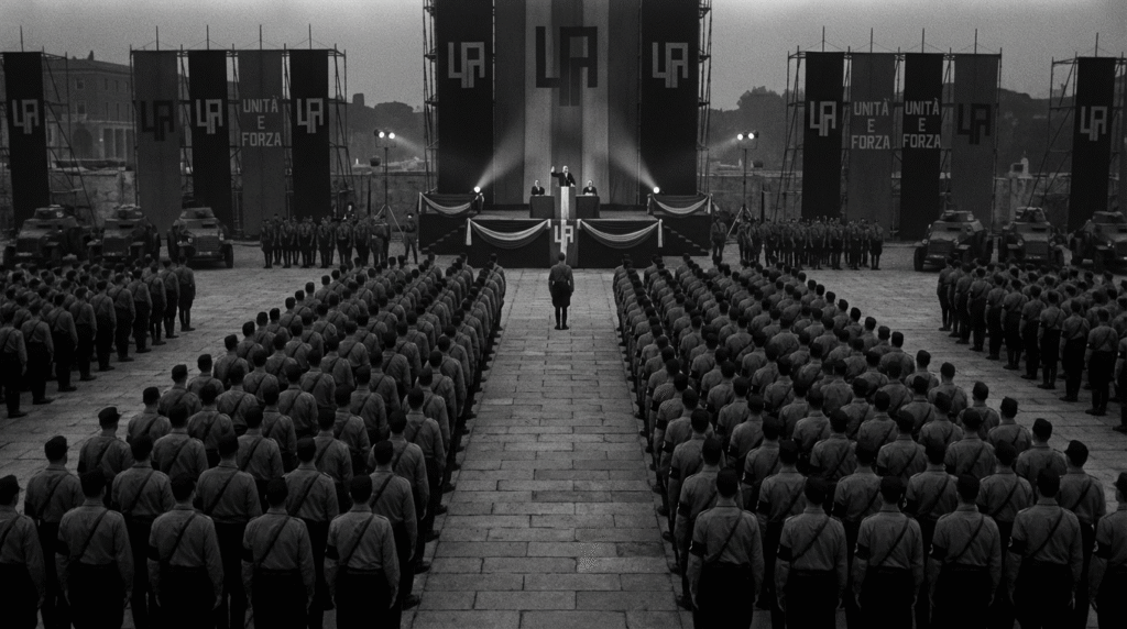 • O Culto da Personalidade: Mussolini era uma mistura de ator de teatro e líder amado por um longo tempo. O sistema transformou-o numa figura quase divina, o Duce (Grande Líder), que tinha todas as respostas. Ele usava a propaganda em massa, incluindo desfiles, rituais, rádio e cinema, para mobilizar a população.